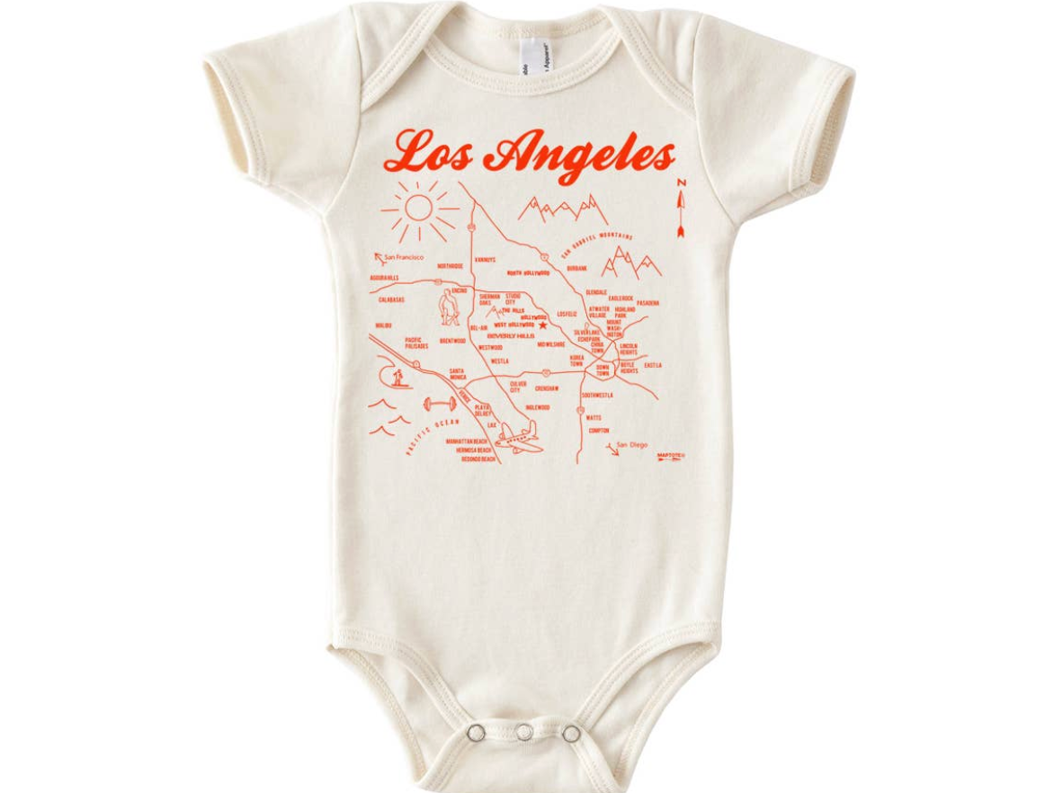 You're never too young to start spreading your Los Angeles pride with our baby one-piece outfit. Makes the perfect baby gift. • 100% certified organic cotton knit and hand silk-screened with water-based ink. • This item is not intended for sleepwear. • Available in sizes 3-6, 6-12, and 12-18 months. • Made in the USA. Designed and Printed in Brooklyn, NY.
