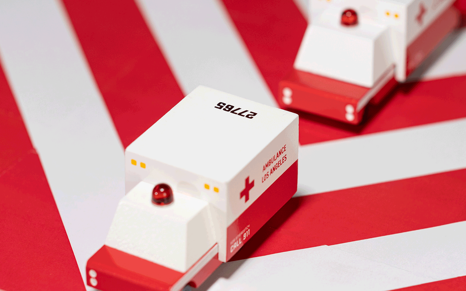 If you're a movie buff, you know LA features prominently in lots of tough screenplays. When make-believe play happens, a tiny LA County rescuer is precisely what's needed to keep all the characters in good health. Tiny silver blanket accessories sold separately. Materials: Solid Beech Wood, water-based paint and clear urethane coat. ABS plastic wheels. Safety tested according to US CPSIA and European, Australian and New Zealand regulations. Not for children under 3 years of age. Dimensions: 3.3" L x 1.6" W x 2.6" H (8.4cm L x 4.1cm W x 6.6cm H) Weight: 6 oz/ 232g Packaging: 3.7" L x 1.7" W x 3.7" H (9.4cm L x 4.3cm W x 9.4cm H) See it in action here: Keywords: ambulance, ambulance van, van, los angeles, candycar, candycars, city, emergency,
