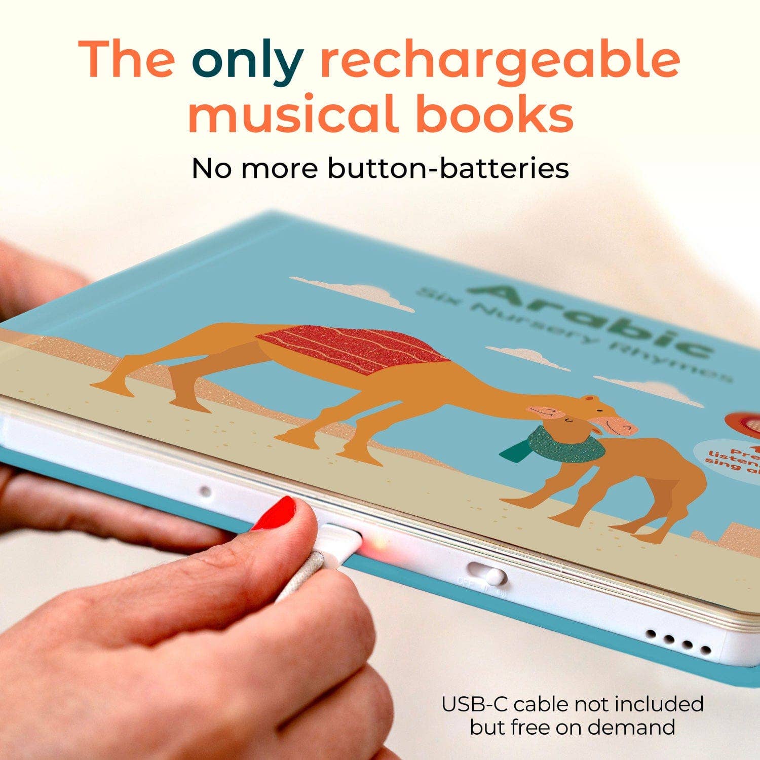 This Arabic Nursery Rhymes sound book provides a musical and linguistic enrichment to toddlers and children alike, featuring traditional Arabic tunes in six different dialects to promote the diversity of the Arabic world. This musical book introduces kids to the various Arabic cultures and contains both Arabic and English lyrics to have fun and learn with the family. The Arabic dialects included are Moroccan, Egyptian, Lebanese, Iraqi, Emirati, and Saudi with respective tracks: Jrada Malha, Thahab El Lail wa Tala el Fajr, Killon Endon Siyarat, Ya bat Ya bat, Sabe Gtewat, and Jamal.
