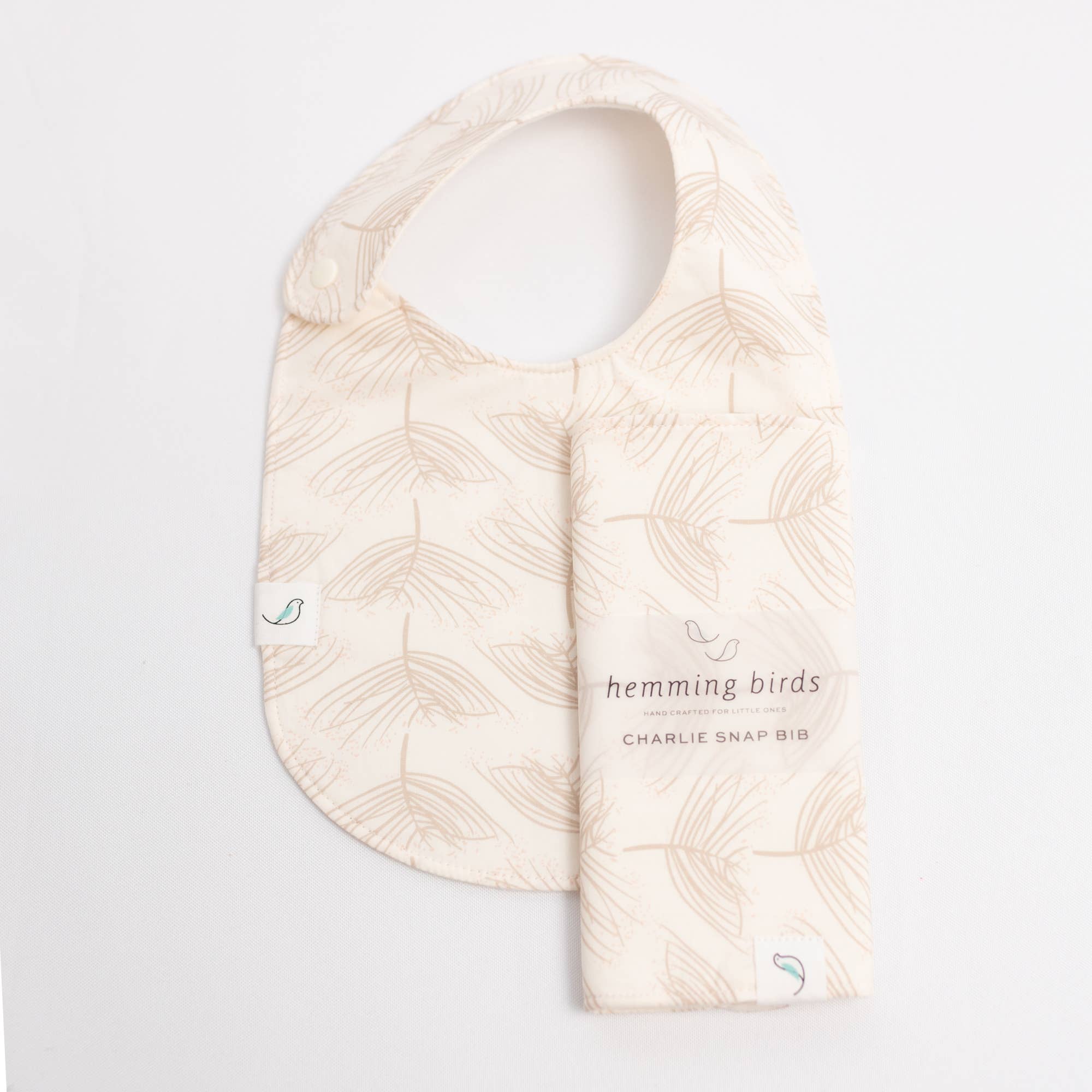 Packaging: Charlie Snap Bibs are folded around card stock, wrapped with a vellum strip, and then sealed inside a crystal clear plastic bag.