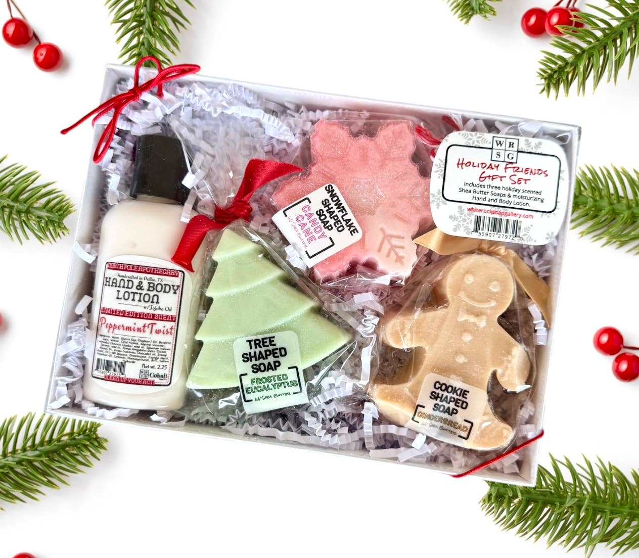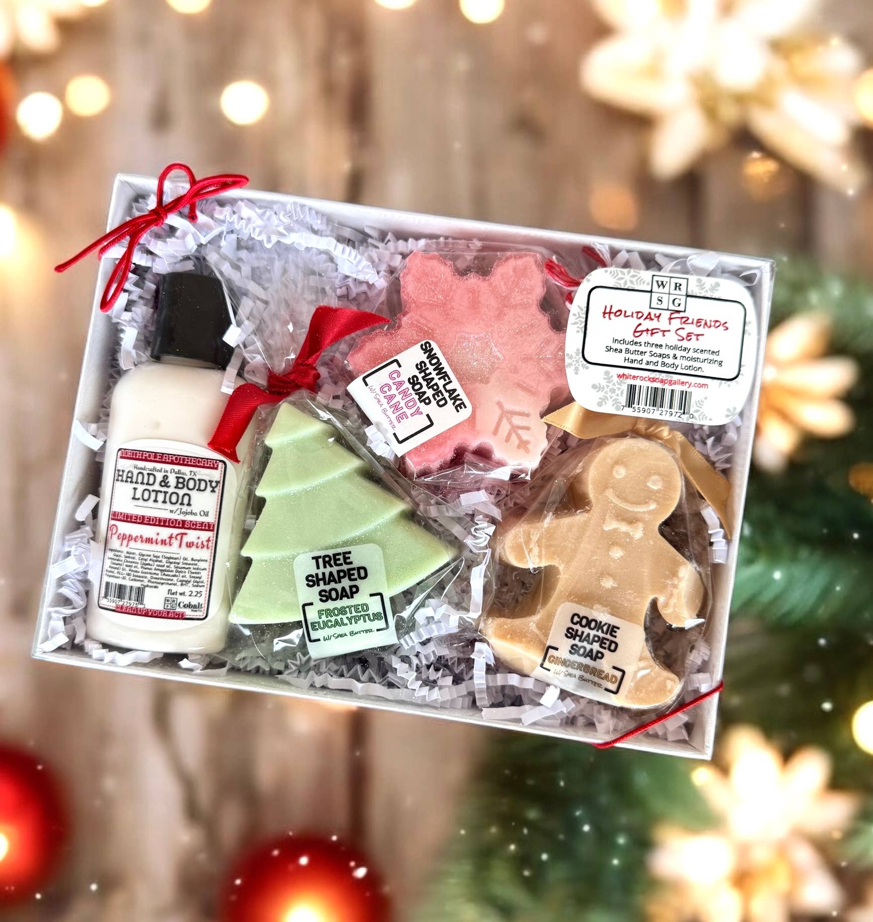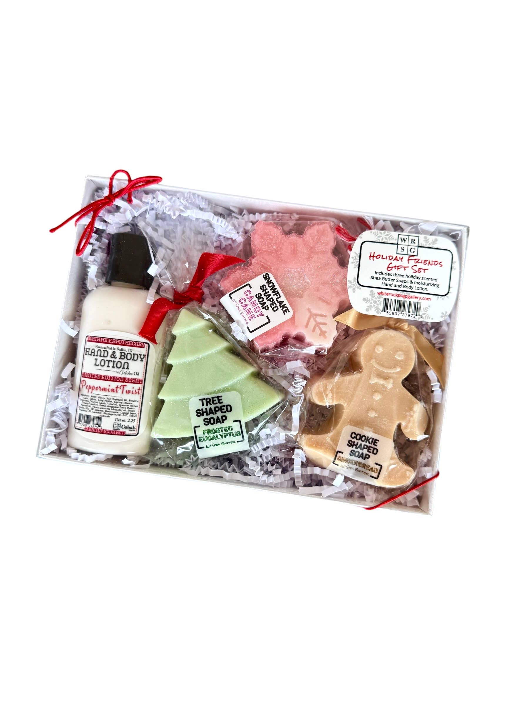Indulge in the ultimate holiday pampering with our cute Holiday Friends Gift Set. This luxurious set includes 3 premium Shea Butter soaps in fun holiday shapes and a moisturizing lotion in a festive holiday scent, all beautifully packaged in a white gift box with a bow. Treat yourself or a loved one to the perfect gift of relaxation and nourishment.
