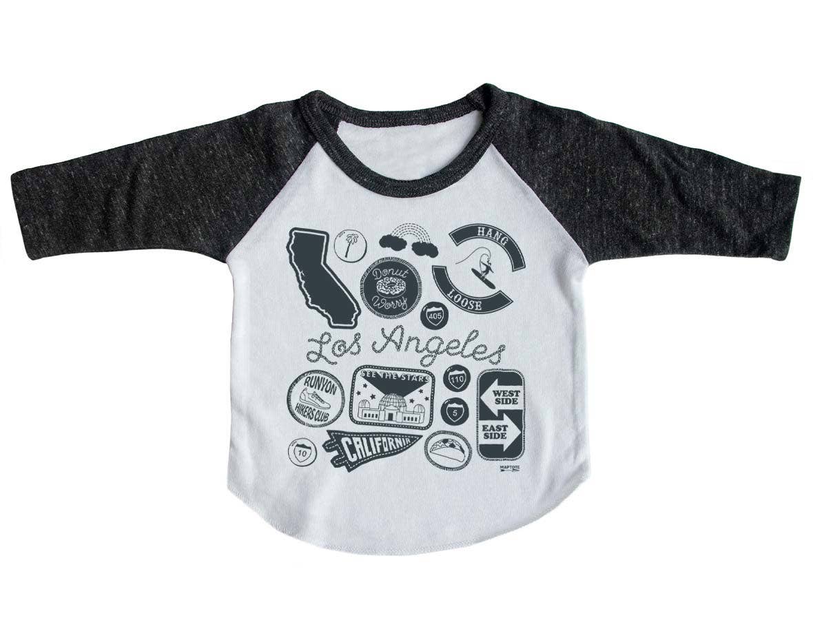 Dress up your little one in this unisex raglan sleeve, baby baseball tee with a whimsical design of patches and pins inspired by Los Angeles, California. • Unisex 3/4-sleeve raglan tee • 50% polyester, 37% combed cotton, 13% rayon • Silkscreened with water-based ink • Available in sizes 3-6, 6-12 and 12-18 months • Made in the USA. Designed and Printed in Brooklyn, NY.