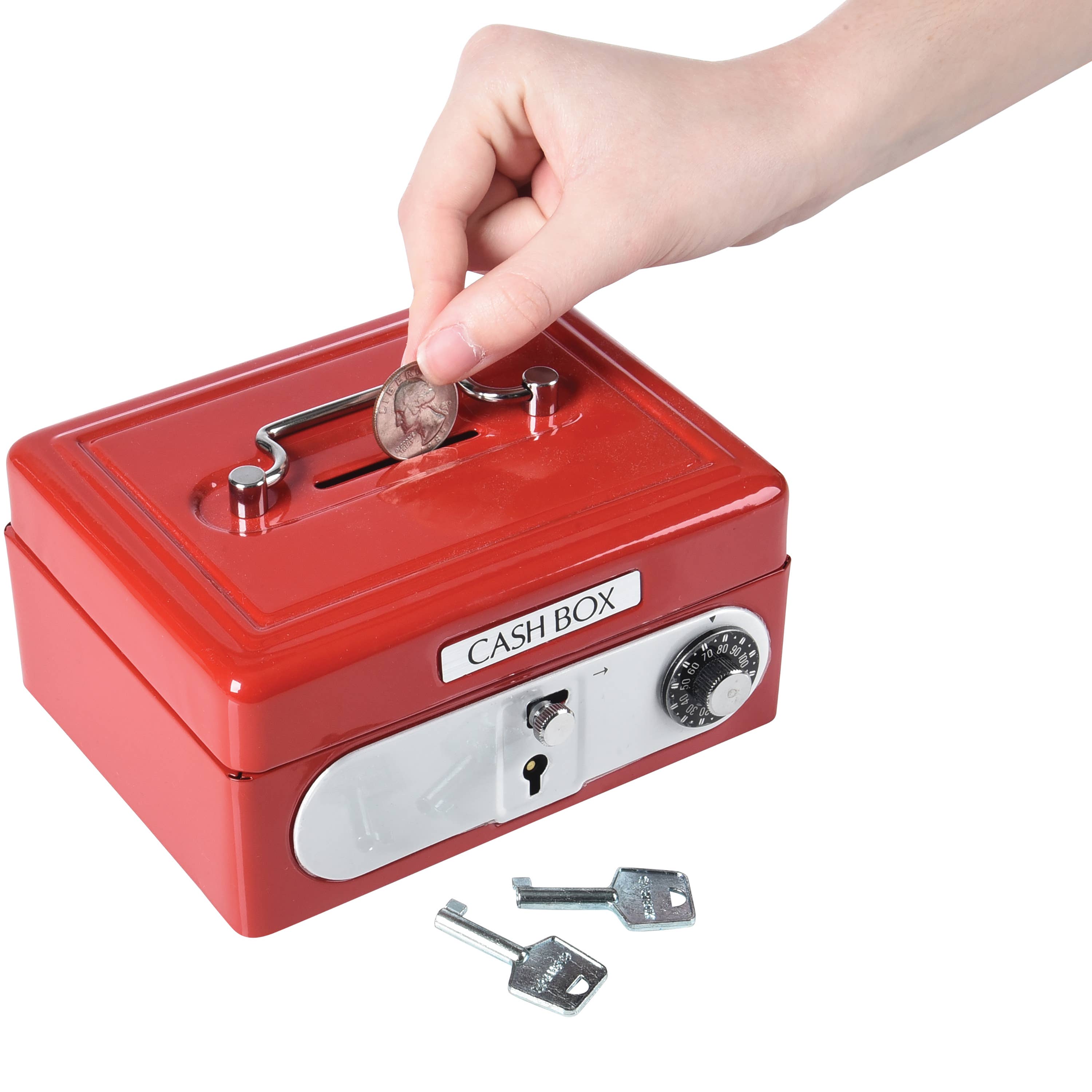 A shiny, colorful, mini metal safe to stash your cash. Includes combination lock and two keys, just in case.