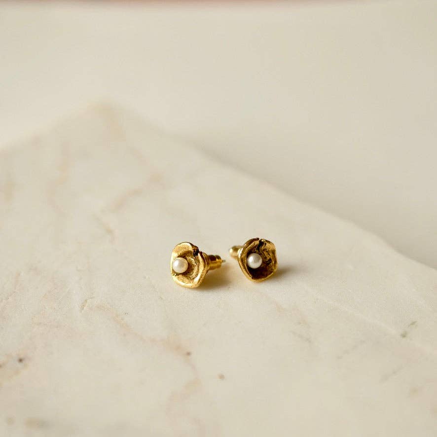 hand fabricated small cups reminiscent of shells are adorned with a tiny faux pearl in these delicate, and elegant lightweight earrings.