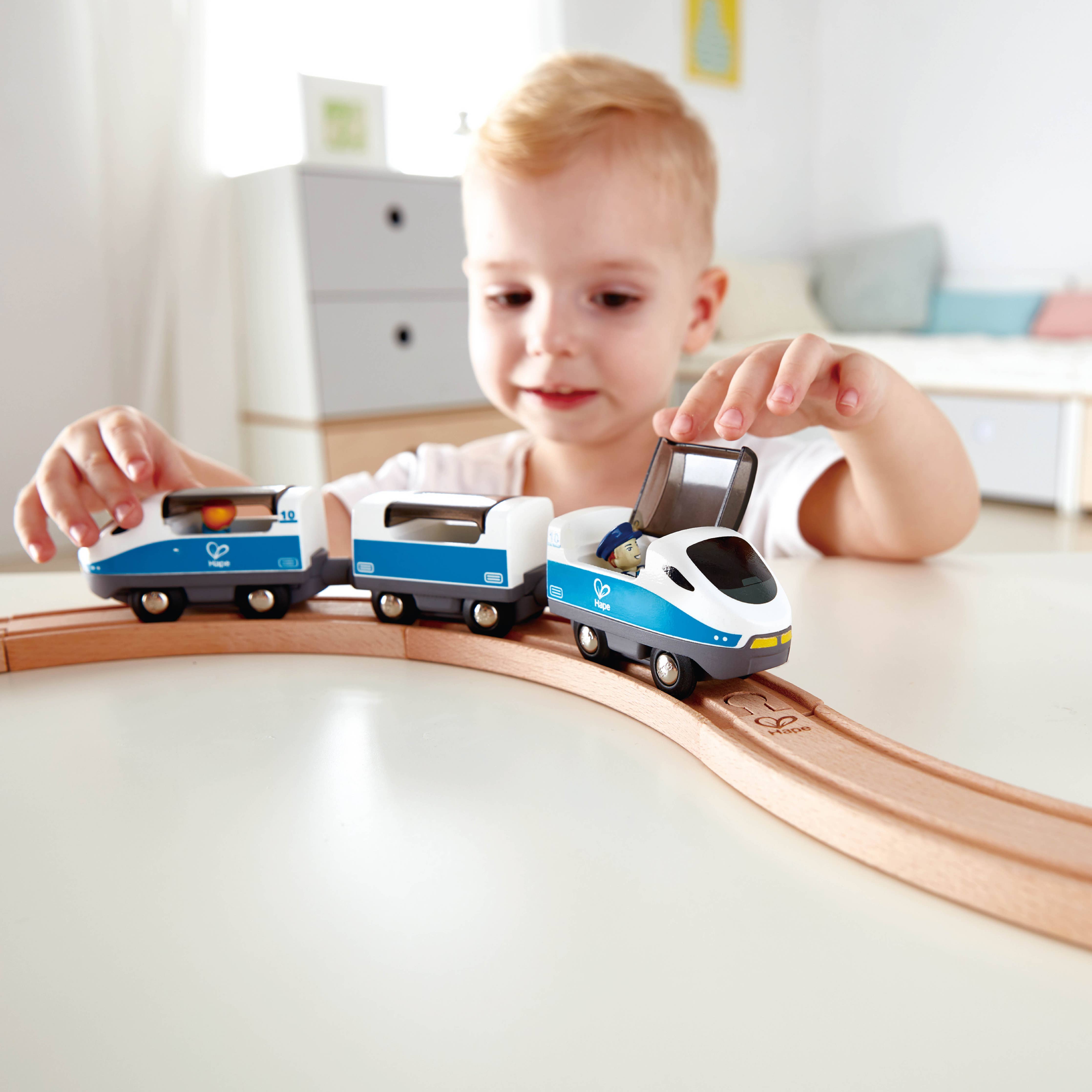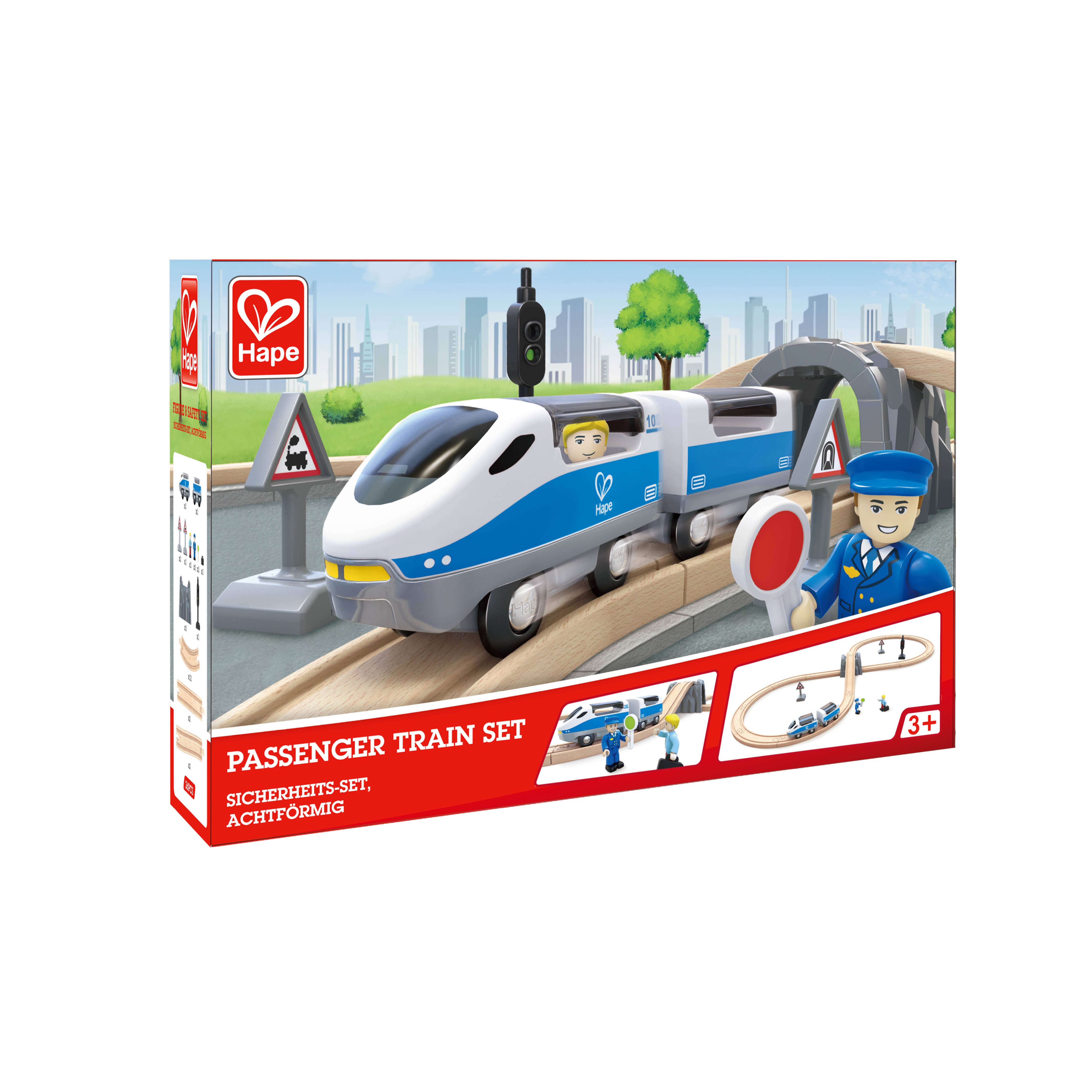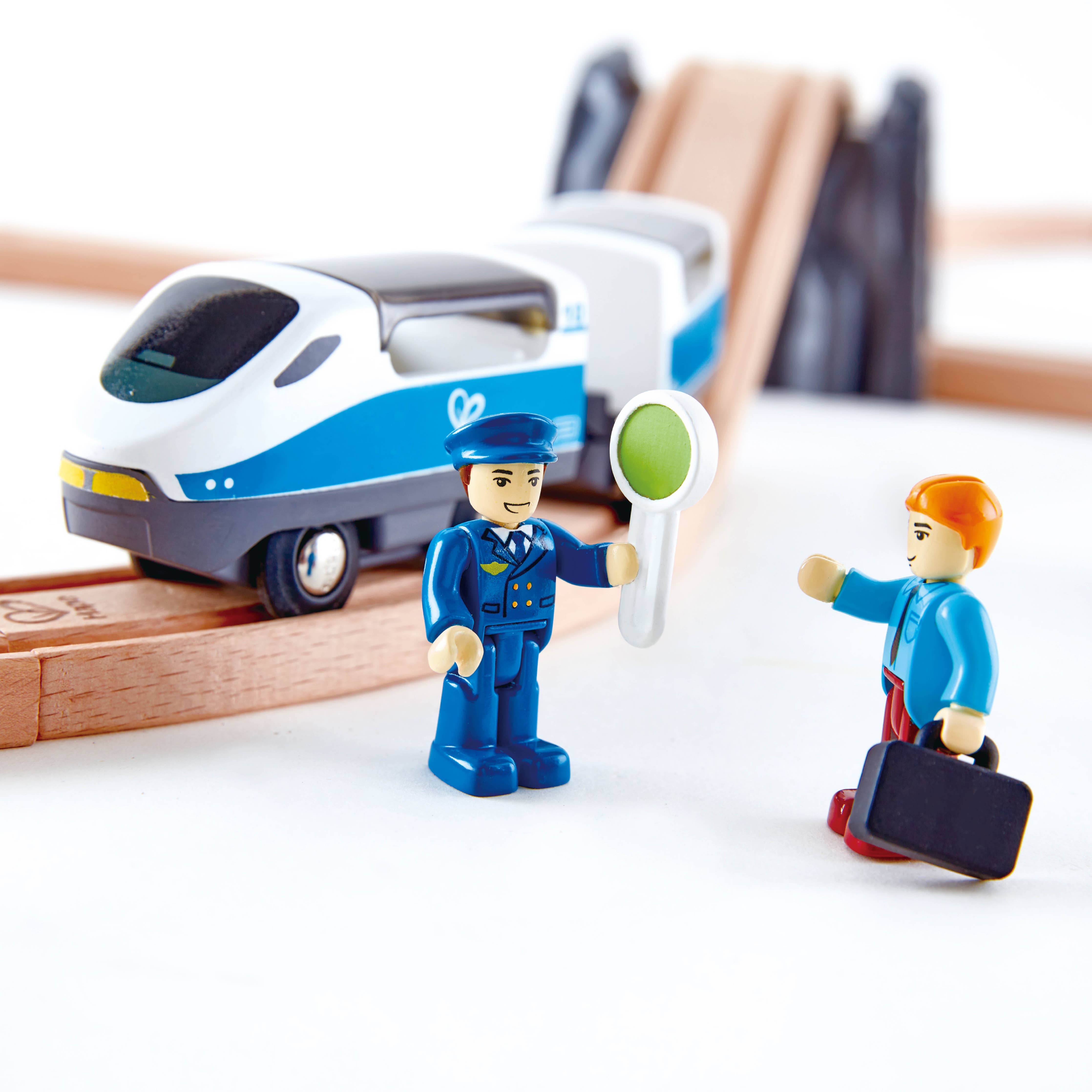 Teach children about safety signals with this figure eight railway set. It comes with a train, a conductor, a passenger and signals to stop the train and get it moving again."