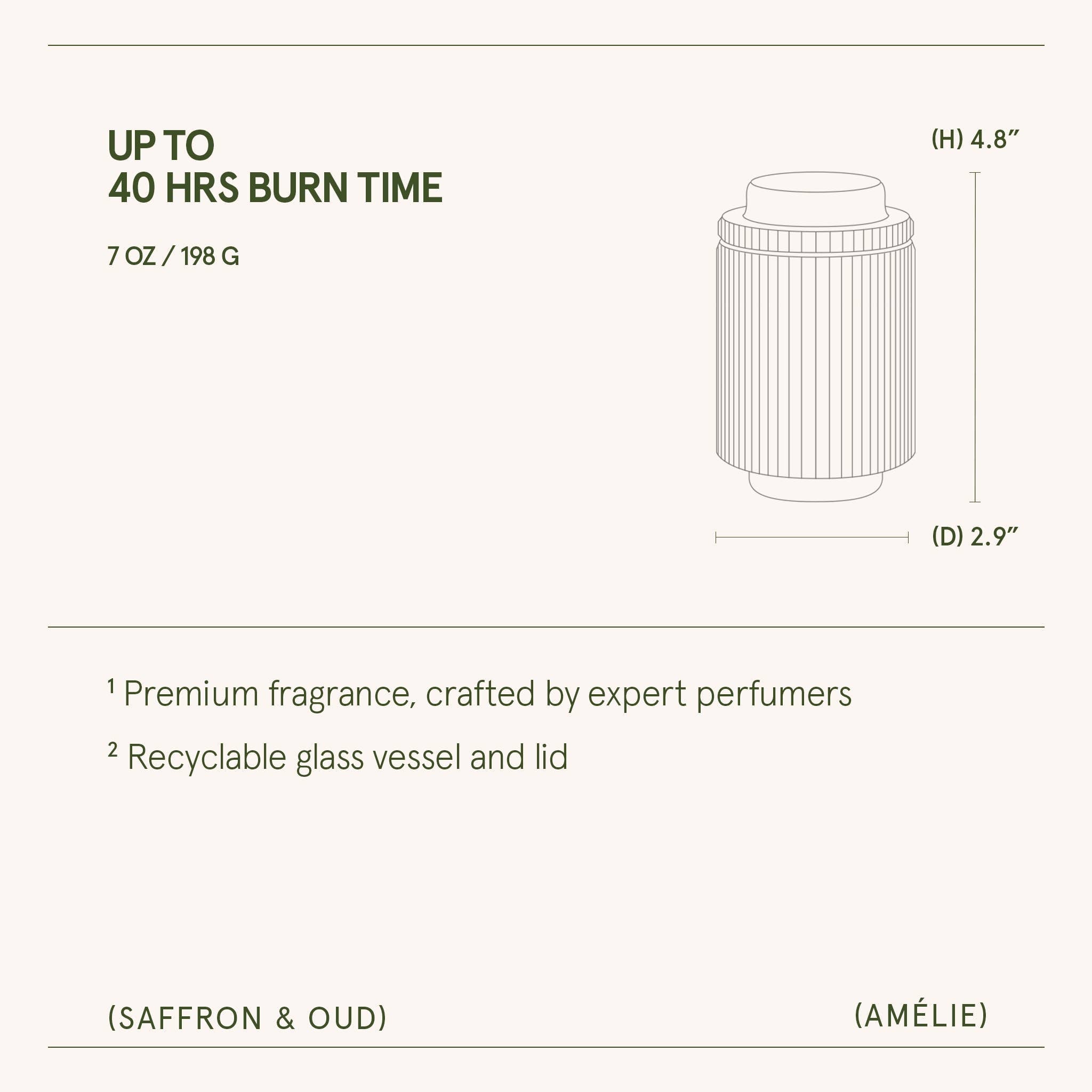 Elevate your space with Amélie: Timeless ribbed glass candles, reminiscent of the Acropolis grandeur. Available in calming colors, they offer a sustainable 40-hour burn with natural soy wax and seamlessly become elegant keepsake containers.